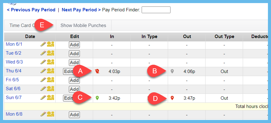 - Grey w/ Slash (not pictured) - No location data was collected with the punch and the employee is excluded from geofence tracking.