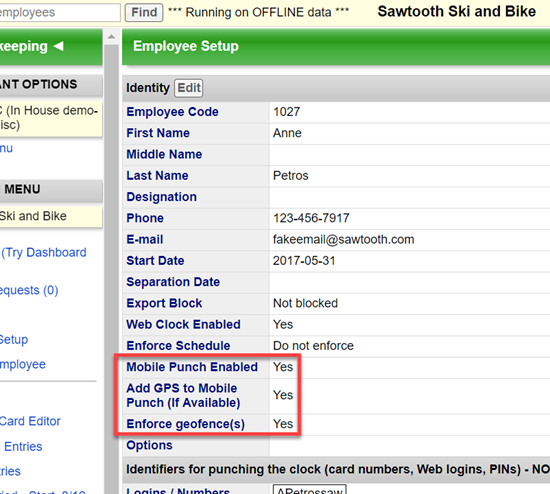Choose Employee Setup from the navigation menu and select an employee by name to view their record. Each employee record has three fields that need to be set to "Yes" for geofencing: