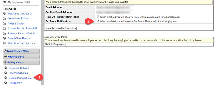 Admins (Client-level users) have the option to receive geofence notifications for all employees by checking an option in their manager profile. This is accessed through the click-path Settings Menu⇒ Update Personal Info and checking Geofence Alert Emails followed by Submit.