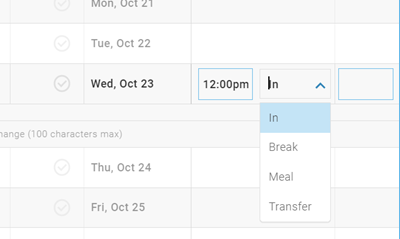 - Select a punch type from the dropdown. The punch types may vary based on your company's configuration. At minimum, you will have "In" as a punch type.