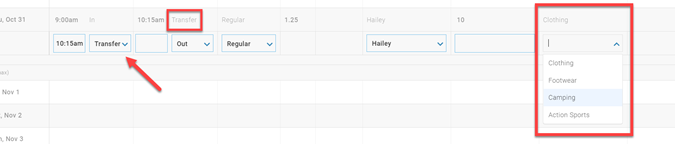 When selecting Transfer as the end time (second half) of a punch set, the time card automatically adds a new punch set that starts with the time of the transfer.