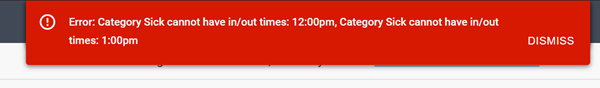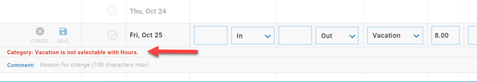 If you receive the following error: "Category cannot have in/out times…", it means the format of the pay category must be an hours entry as opposed to an In and Out.